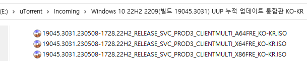 아래 파일은 UUP dump에서 만든 스크립트를 이용해서 MS에서 배포하는 파일(ESD, cab파일)로 만든 순수 ISO 파일입니다.