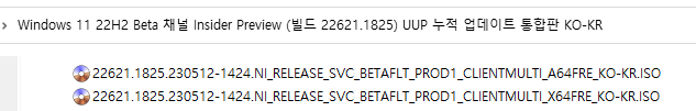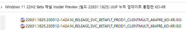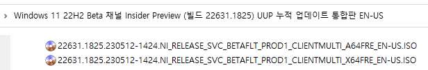 아래 파일은 UUP dump에서 배포하는 스크립트를 이용해서 MS에서 배포하는 파일(ESD, cab파일)로 만든 순수 ISO 파일입니다.