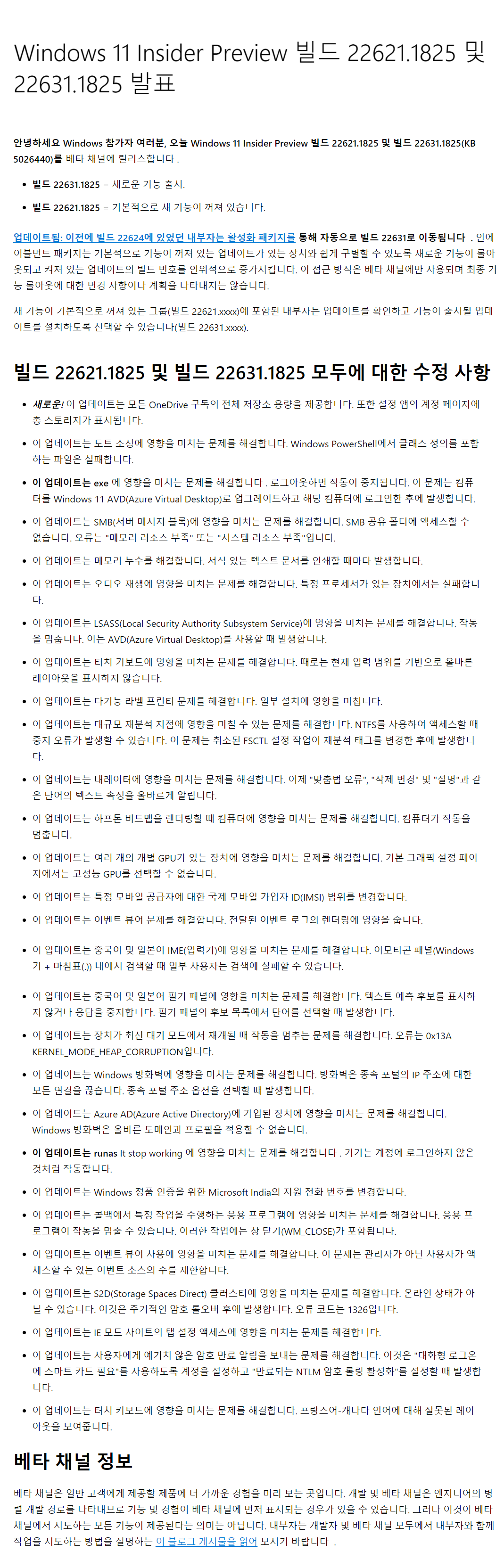 오늘 Windows 11, 22H2 빌드 누적 업데이트 22621.1825 / 22631.1825 배포되었습니다.