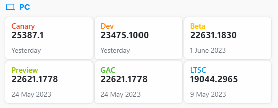 Canary 채널 : 개발 주기 초기에 최신 플랫폼 변경 사항을 미리 테스트. 고객에게 출시되기 전에 더 긴 리드 타임이 필요한 플랫폼 변경 사항을 미리 볼 수 있음. 변경 사항 중 일부는 제공되지 않으며 나머지는 준비가 되면 향후 Windows 릴리스에 표시