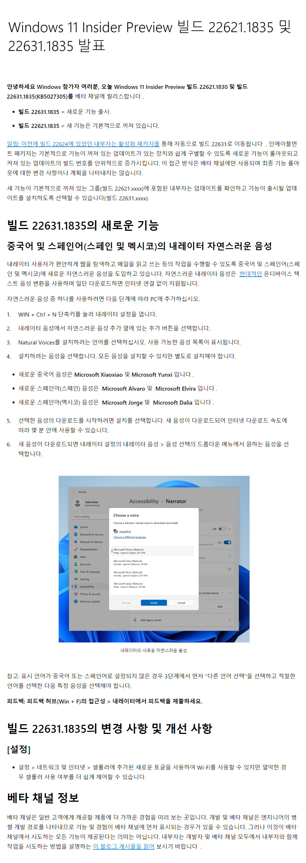 ○ 베타 채널 [Beta] = Windows 11 : 빌드 22621.1835 / 22631.1835 (= 참가자 빌드)