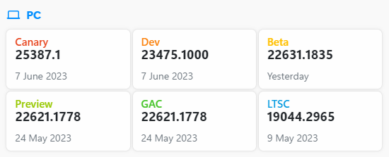 - Canary 채널 : 개발 주기 초기에 최신 플랫폼 변경 사항을 미리 테스트. 고객에게 출시되기 전에 더 긴 리드 타임이 필요한 플랫폼 변경 사항을 미리 볼 수 있음. 변경 사항 중 일부는 제공되지 않으며 나머지는 준비가 되면 향후 Windows 릴리스에 표시