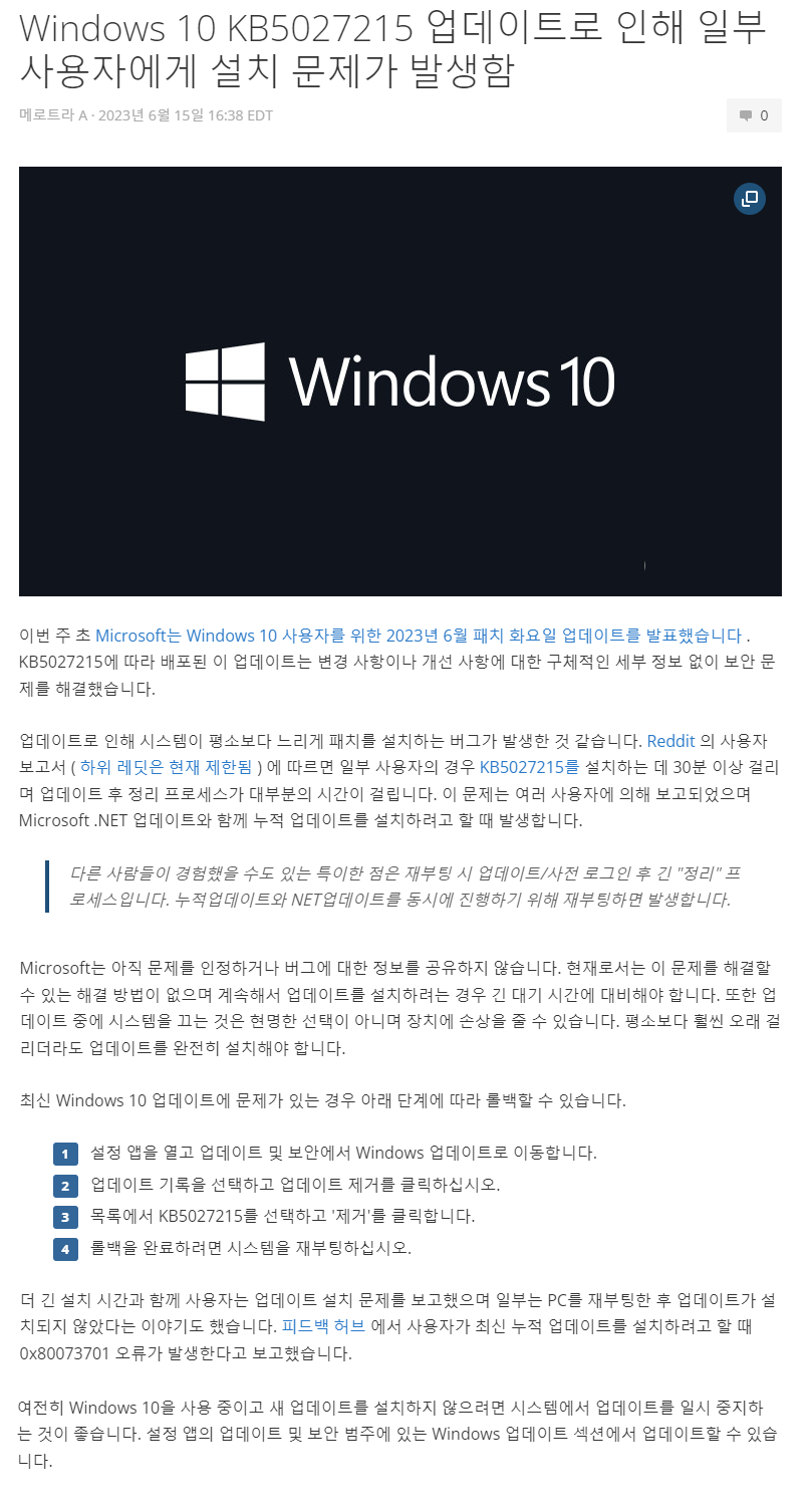 혹시 컴퓨터가 느려진 분들은 KB5027215 업데이트를 제거하시길 바랍니다...ㅠ