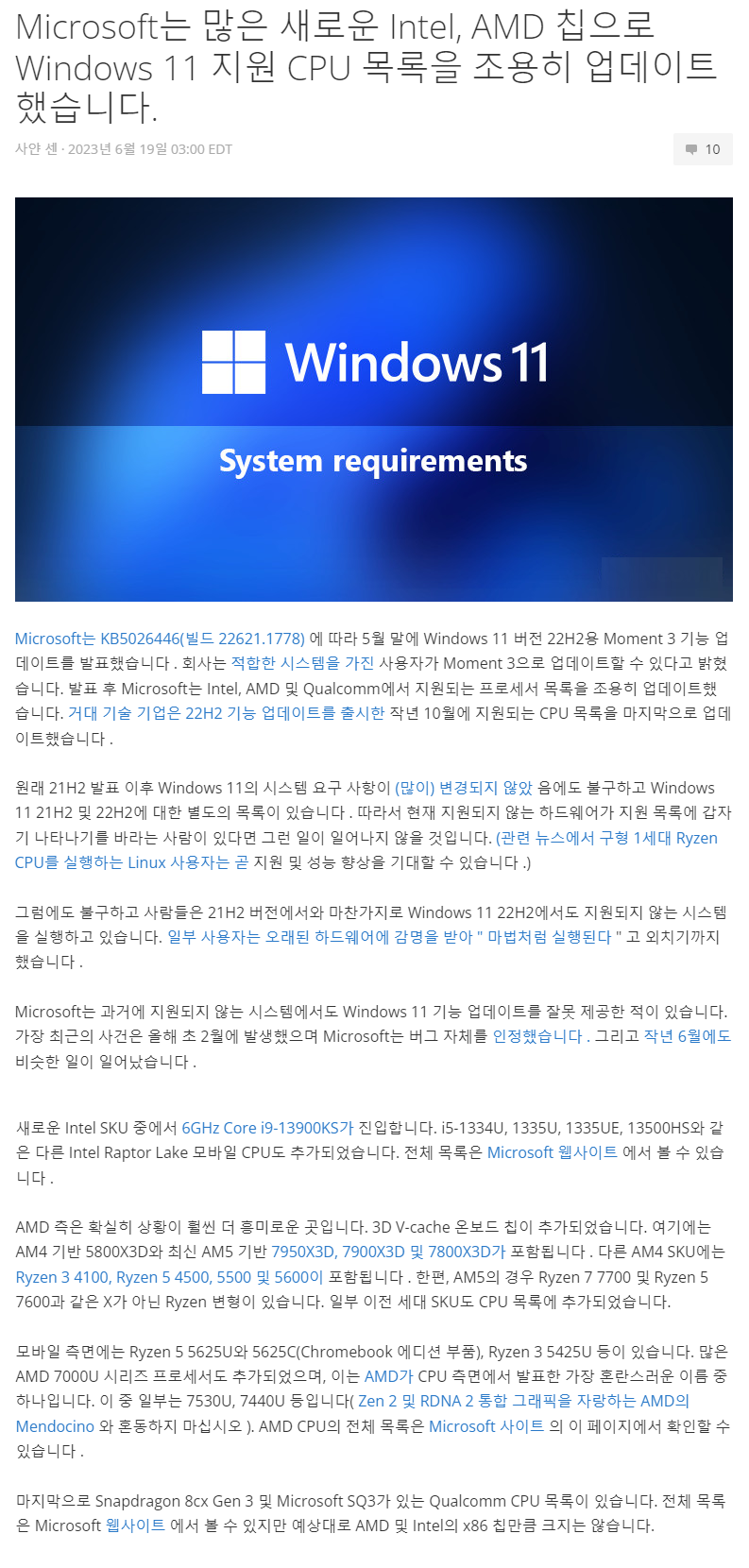 - 인텔 CPU 목록: learn.microsoft.com/windows-11-22h2-supported-intel-processors