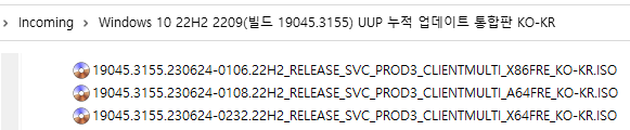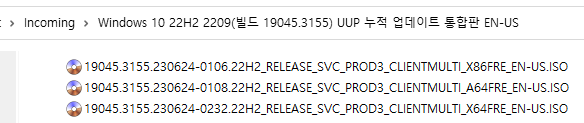 아래 파일은 UUP dump에서 만든 스크립트를 이용해서 MS에서 배포하는 파일(ESD, cab파일)로 만든 순수 ISO 파일입니다.