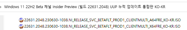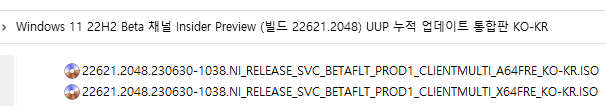 아래 파일은 UUP dump에서 배포하는 스크립트를 이용해서 MS에서 배포하는 파일(ESD, cab파일)로 만든 순수 ISO 파일입니다.
