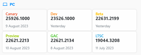 - Canary 채널 : 개발 주기 초기에 최신 플랫폼 변경 사항을 미리 테스트. 고객에게 출시되기 전에 더 긴 리드 타임이 필요한 플랫폼 변경 사항을 미리 볼 수 있음. 변경 사항 중 일부는 제공되지 않으며 나머지는 준비가 되면 향후 Windows 릴리스에 표시