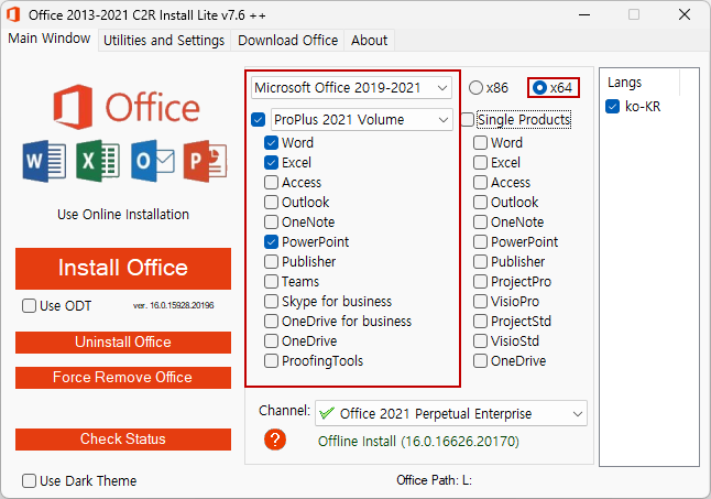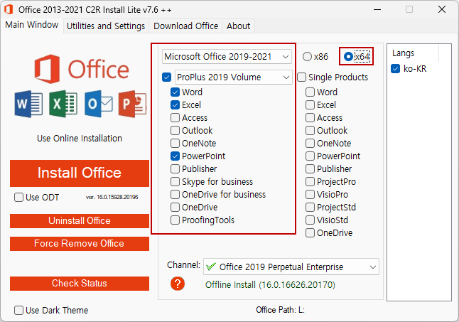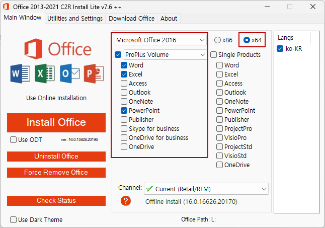 Word, Excel, PowerPoint 프로그램만 설치합니다.