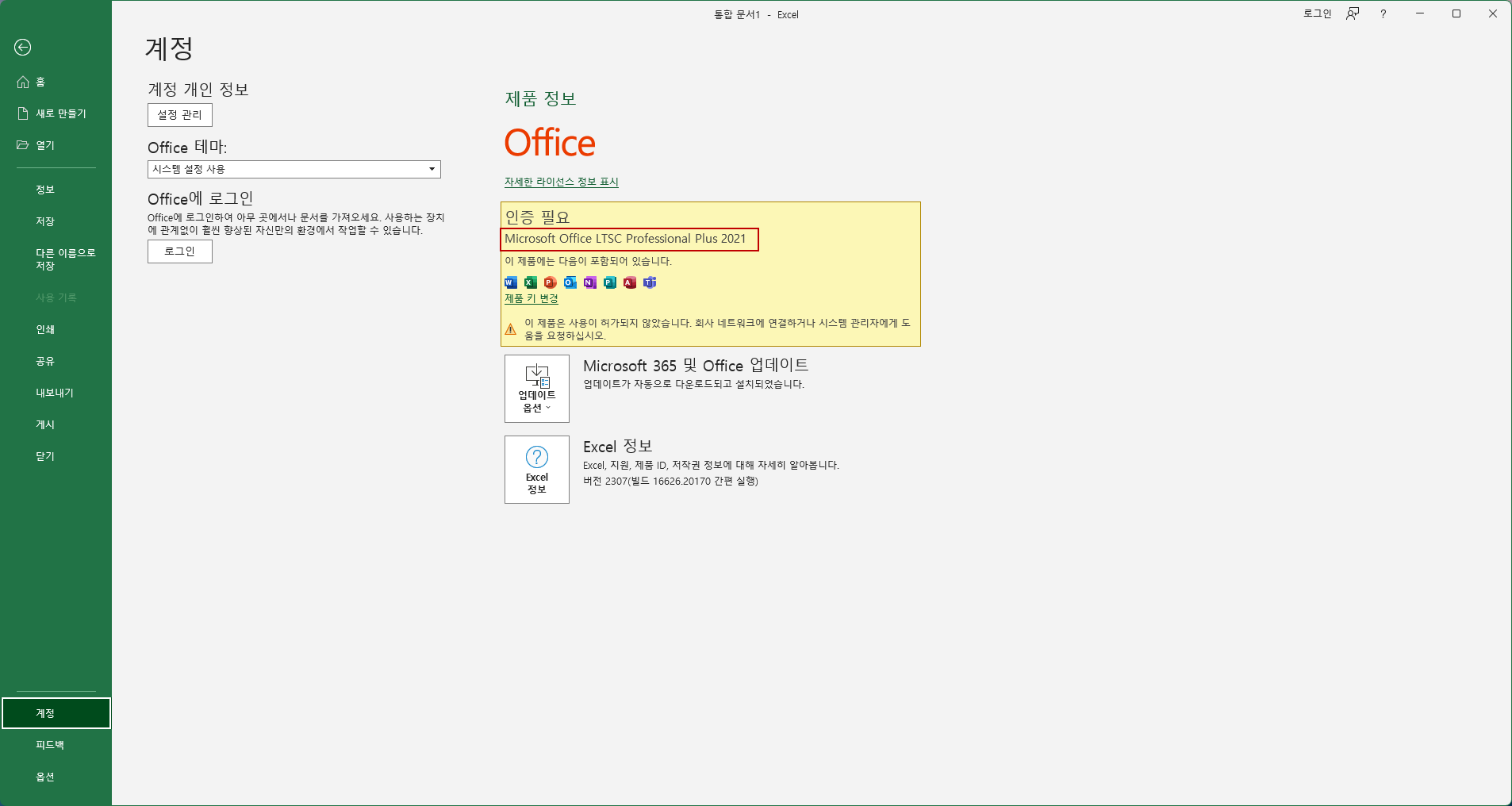 Offcie 2021 Excel로 표시되지 않고 그냥 Excel로 표기됩니다.