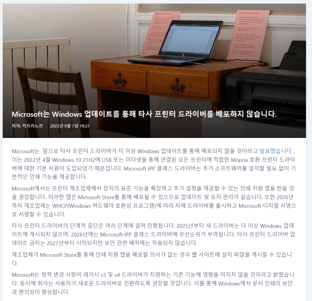 MS에서 더이상 타사 프린터 드라이버를 제공하지 않는다고 합니다.ㅠ