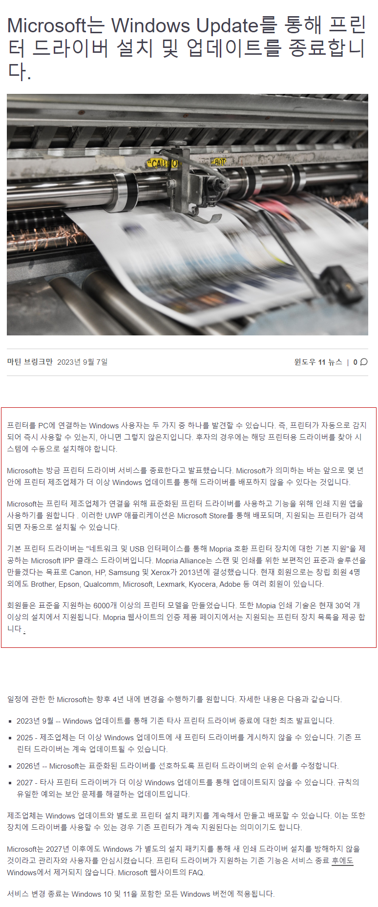 윈도우 10, 프린터별 드라이버 설치 없이 모프리아 인증 프린터 지원