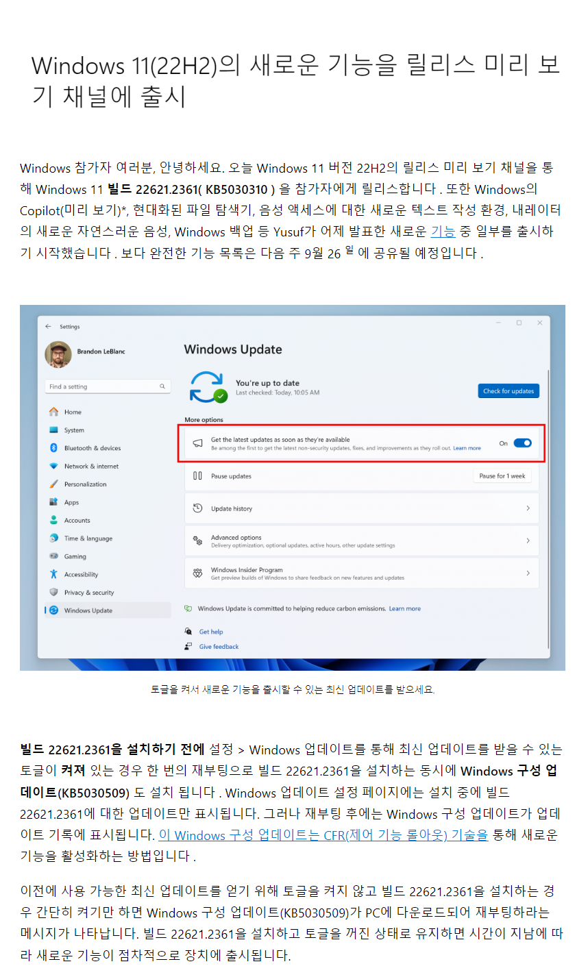 1. Windows 11, 빌드 22621.2361으로 업데이트하는 방법 (= RP 참가자 전용)