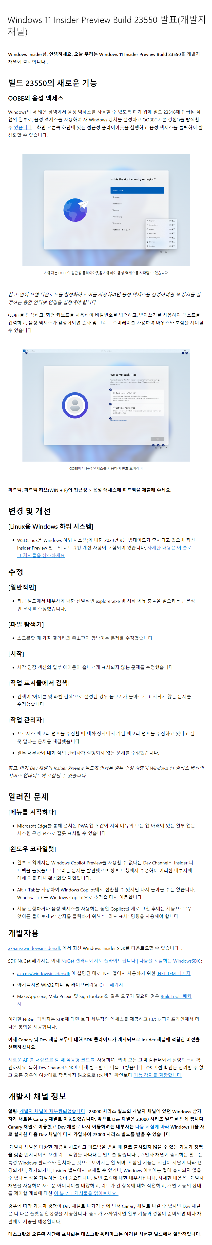 이 빌드는 Windows 11 (Version 23H2) 버전을 위한, 개발자(Dev) 채널의 참가자들에게 배포되는 프리뷰(테스트) 빌드입니다.
