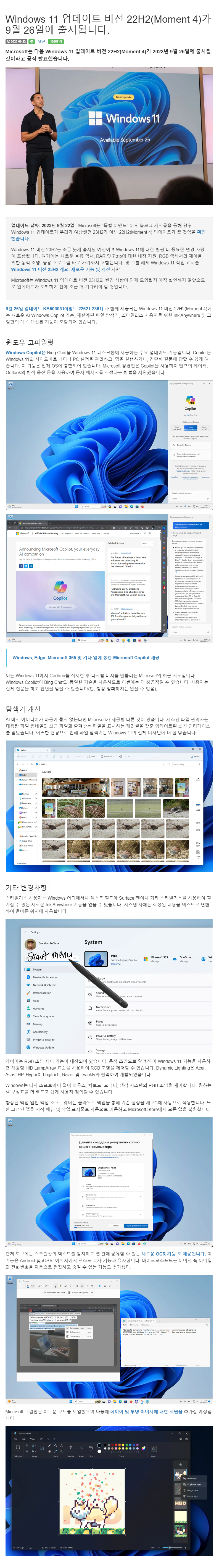 9월 26일 (한국시간 27일)에 Windwos 11 22H2 (빌드 22621)의 새로운 기능이 추가된 모멘트 업데이트 4가 출시됩니다.