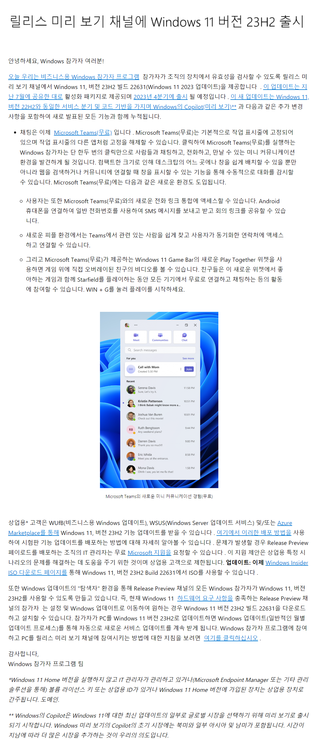 ○ 미리보기 채널 [Release Preview] = Windows 11 : 빌드 22621.2361 (= 참가자 빌드)