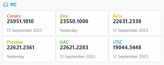 - Canary 채널 : 개발 주기 초기에 최신 플랫폼 변경 사항을 미리 테스트. 고객에게 출시되기 전에 더 긴 리드 타임이 필요한 플랫폼 변경 사항을 미리 볼 수 있음. 변경 사항 중 일부는 제공되지 않으며 나머지는 준비가 되면 향후 Windows 릴리스에 표시