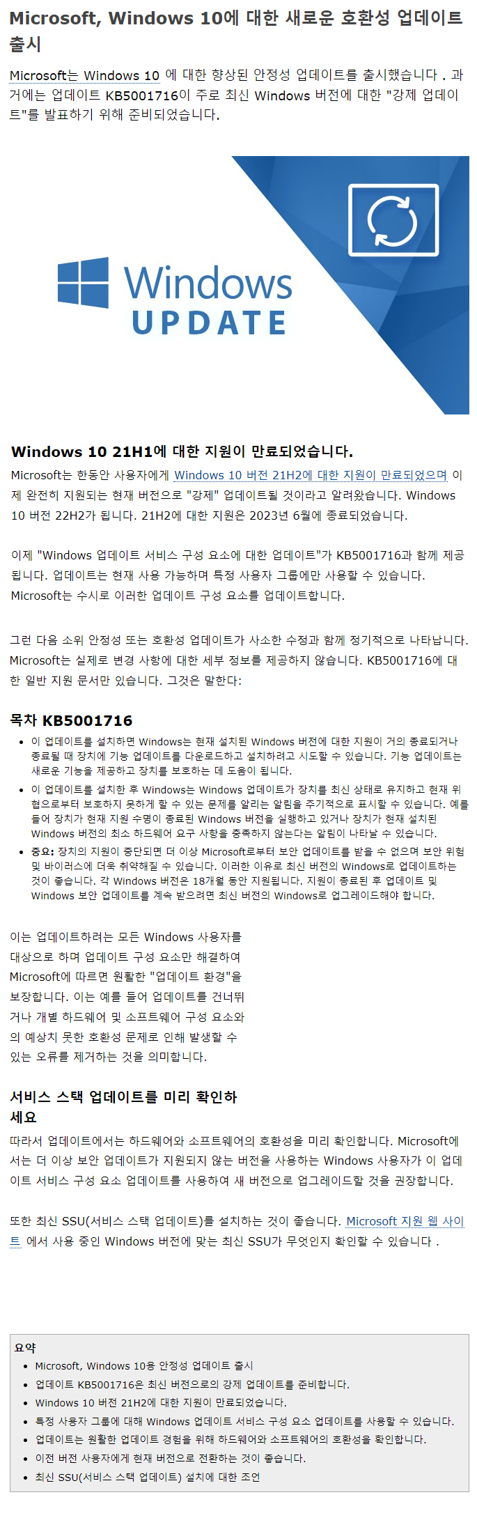 이제 MS는 KB5001716 파일을 자동업데이트를 통해서 배포하여