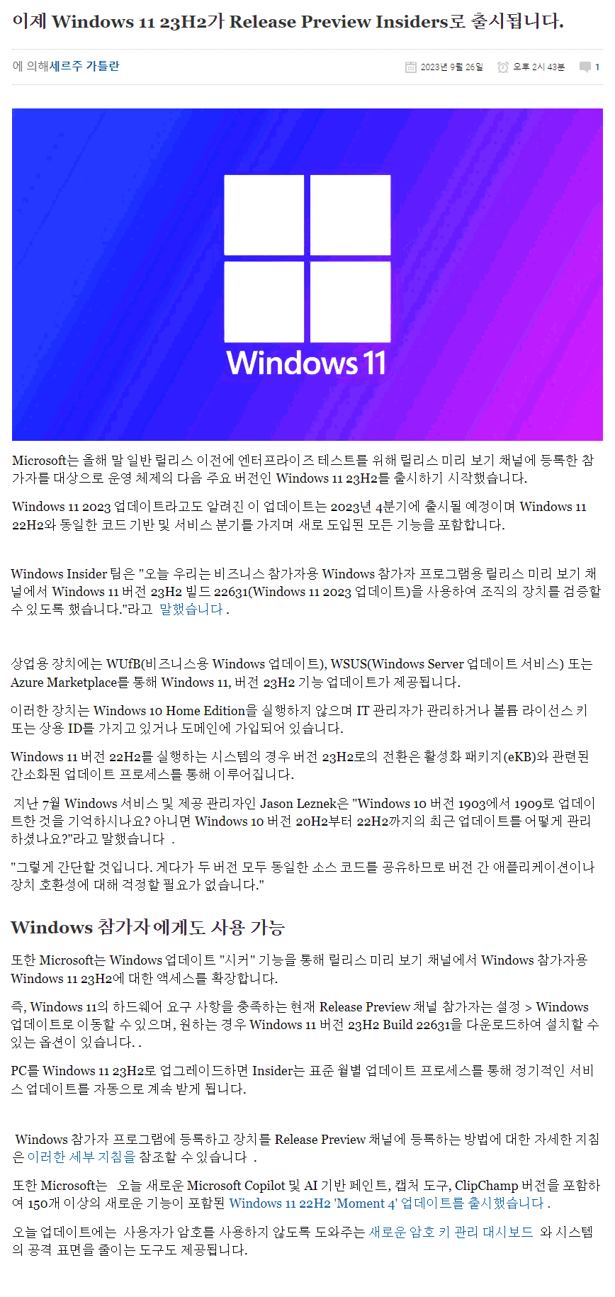 - 1단계 - 2023년 9월 26일: Microsoft는 릴리스 미리 보기 채널에서 Windows 11 23H2를 미리 볼 수 있습니다.
