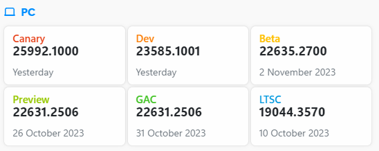 - Canary 채널 : 개발 주기 초기에 최신 플랫폼 변경 사항을 미리 테스트. 고객에게 출시되기 전에 더 긴 리드 타임이 필요한 플랫폼 변경 사항을 미리 볼 수 있음. 변경 사항 중 일부는 제공되지 않으며 나머지는 준비가 되면 향후 Windows 릴리스에 표시