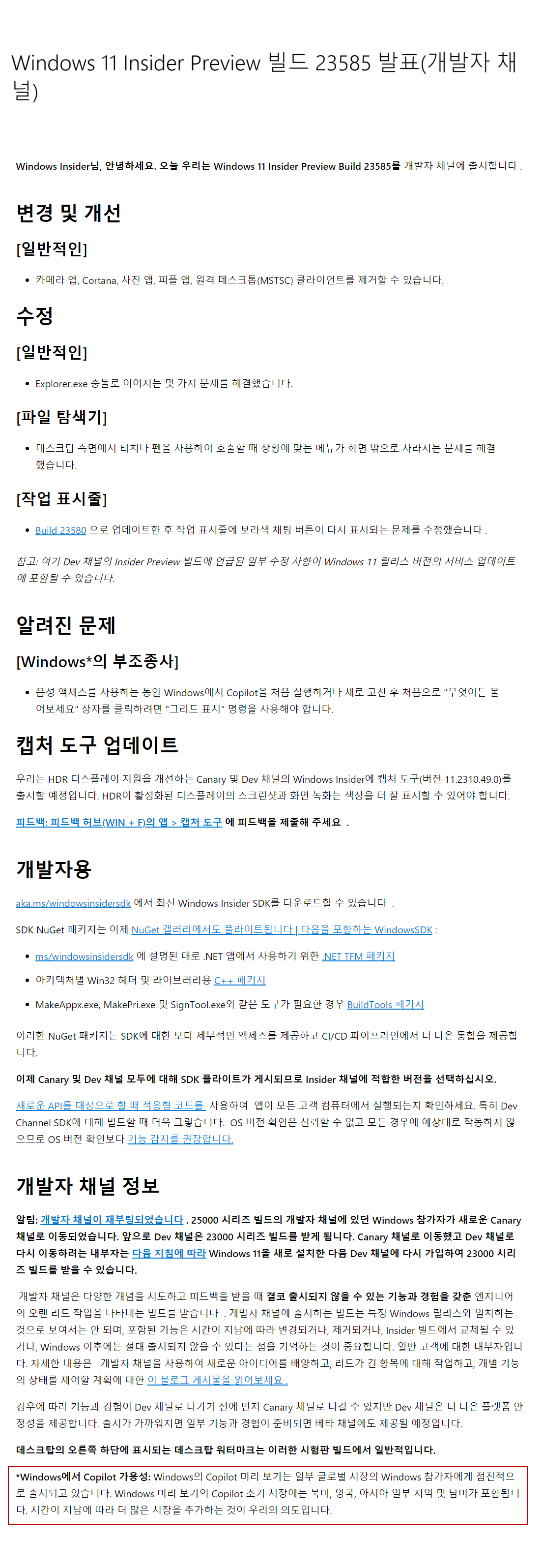 이 빌드는 Windows 11 (Version 23H2) 버전을 위한, 개발자(Dev) 채널의 참가자들에게 배포되는 프리뷰(테스트) 빌드입니다.