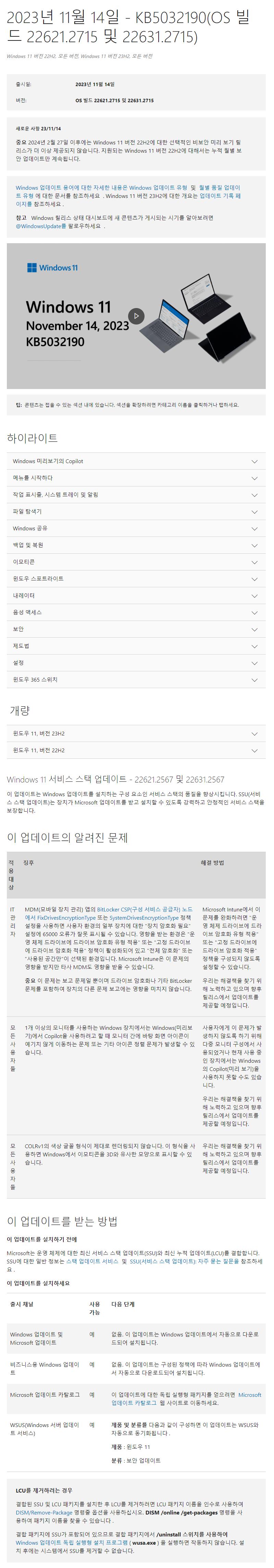 KB5032190 = 누적 업데이트(22631.2715) (Cumulative update : CCU) (2023-11-14)