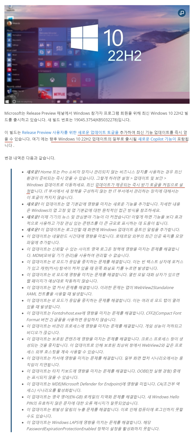 Windows 10 22H2 19045.3754에는 아래와 같은 업데이트 토글이 추가되었습니다.