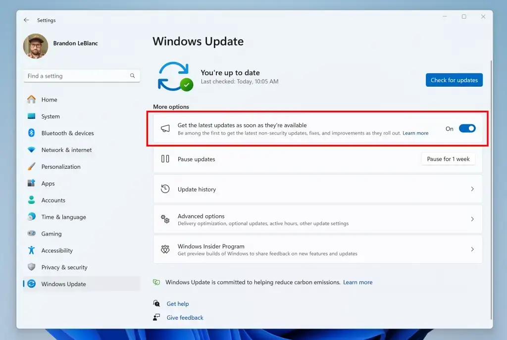 원하는 사용자들에게는 "최신 업데이트가 제공되는 즉시 받기" 토글을 켜짐으로 설정할 수 있습니다.
