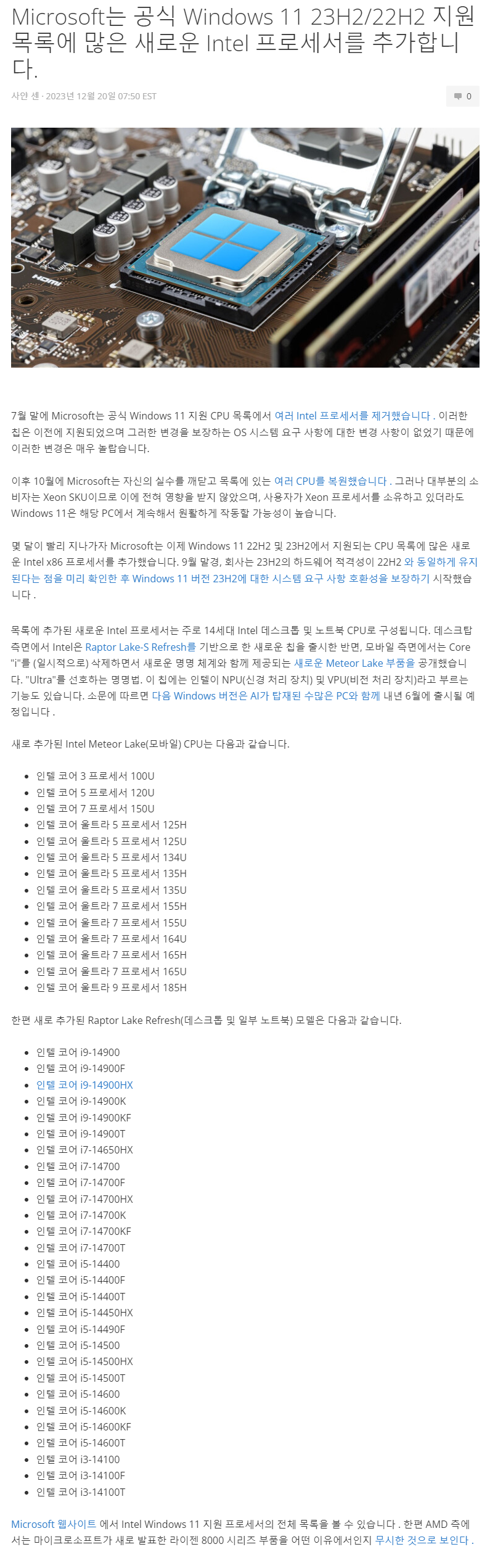 | Microsoft는 Intel을 추가하지만 Windows 11 공식 지원 프로세서 목록에서 새로운 AMD CPU를 건너뜀 (2) | 2023.12.21 |