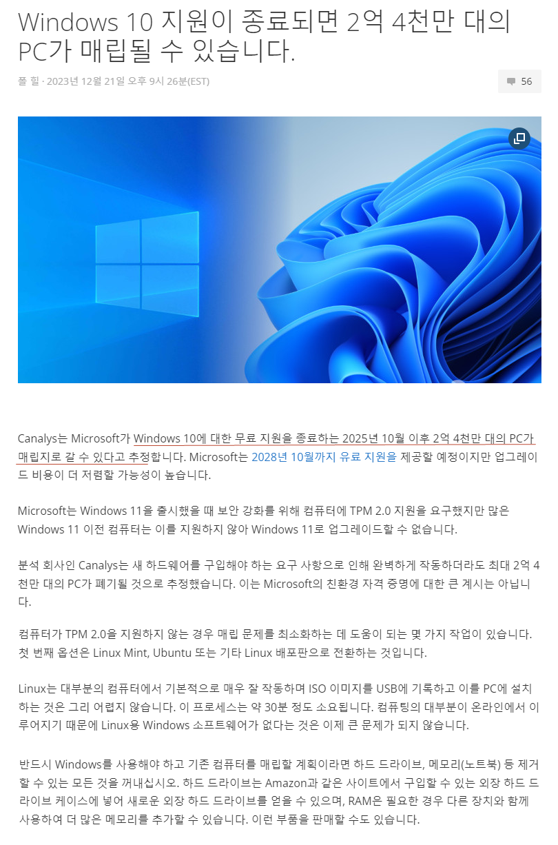 전세계에서 아직도 Windows 10을 사용하는 사용자가 2억 4천만이나 된다고 하네요..