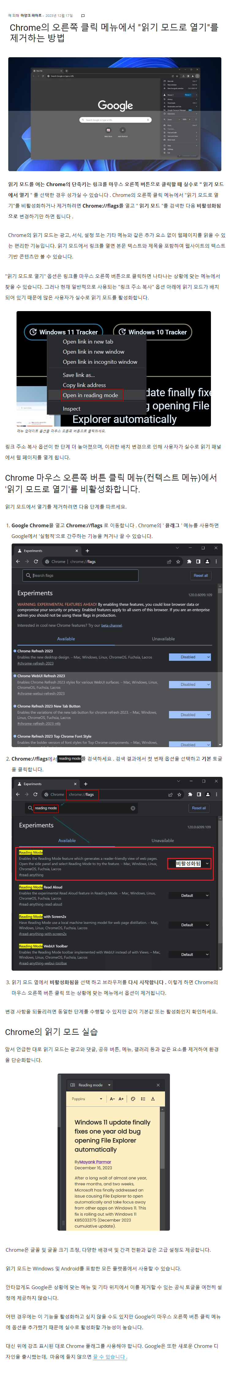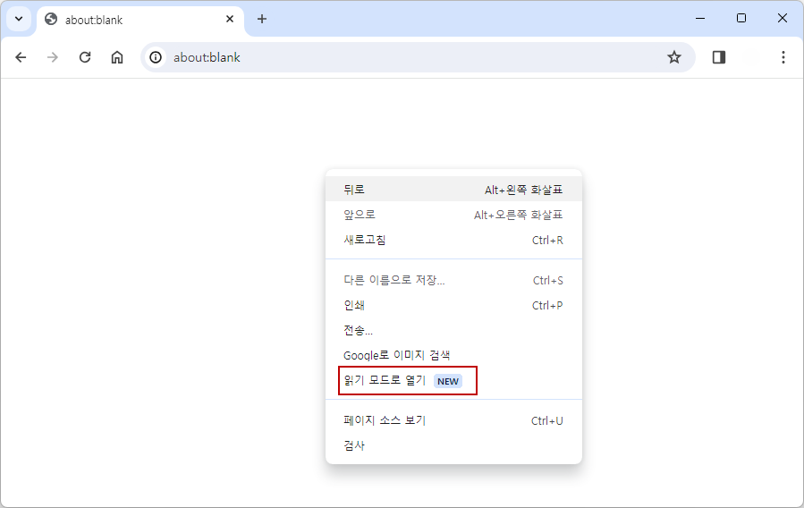 크롬 최신 버전에서 언제부터인가 오른쪽 버튼 메뉴에 아래와 같이 "읽기 모드로 열기" 항목이 생겼습니다.