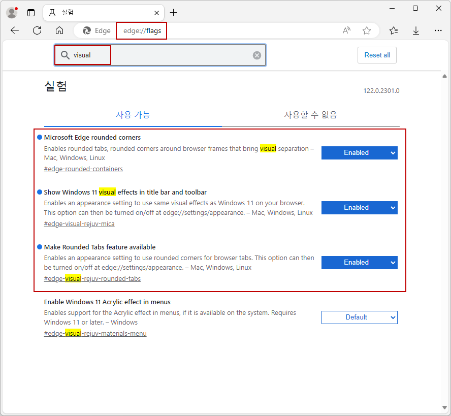 아래 그림처럼 시각효과 설정항목이 새로 생겨서 활성화되어 있습니다.ㅎㅎ