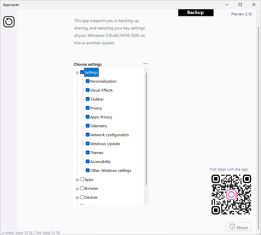 AppCopier는 현재 개발 중입니다. 그러나 이미 Windows 백업의 기본 기능을 제공하고 있습니다. 즉, Windows 11 데이터 보호 설정, 작업 표시줄 설정, 업데이트 및 앱 설정은 물론 개인 설정 아래의 설정도 로컬에 저장하고 복원할 수 있습니다. 각 포인트에 대해 정확히 무엇이 저장되고 있는지 상단에 설명이 표시됩니다.