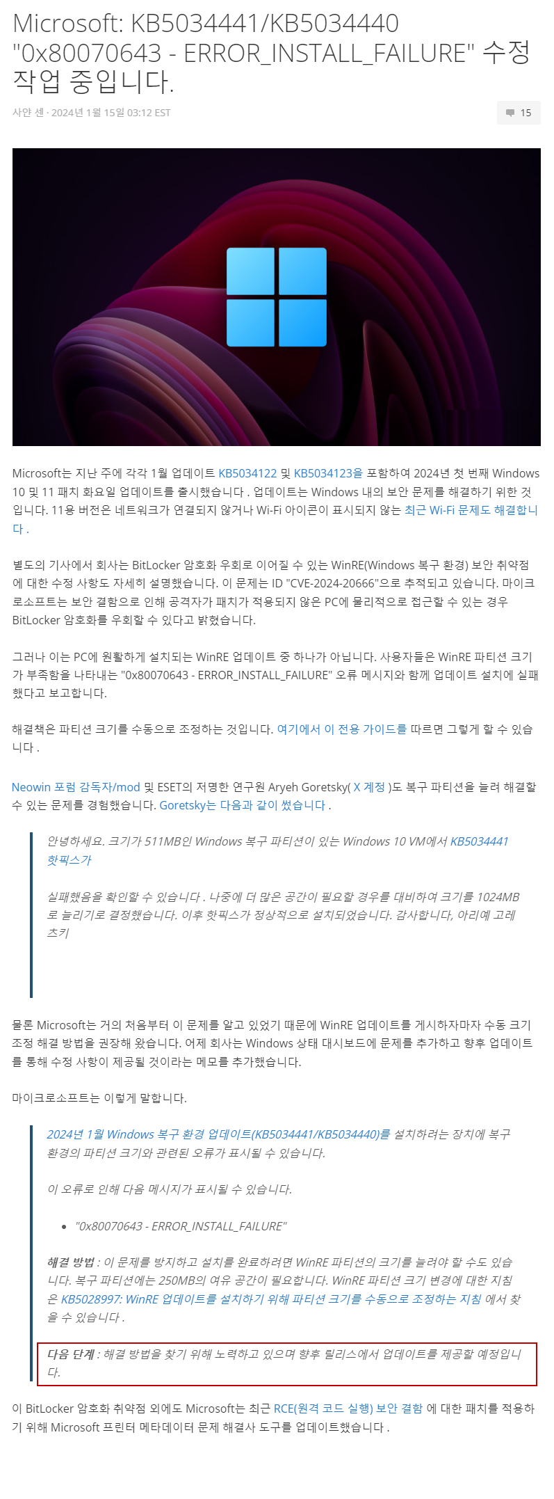 | Windows 10, 19045 빌드에서 보안 업데이트 설치시 0x80070643 오류가 발생할 수 있습니다 (26) | 2024.01.10 |