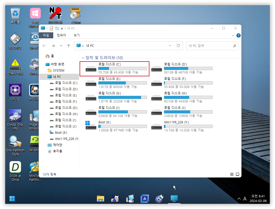 2) 설치하고 나서 PE로 부팅하면 Windows가 설치된 파티션은 드라이브 문자가 할당되어 있지도 않구요