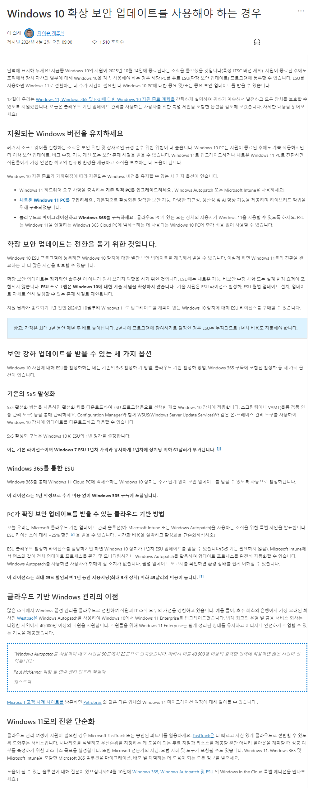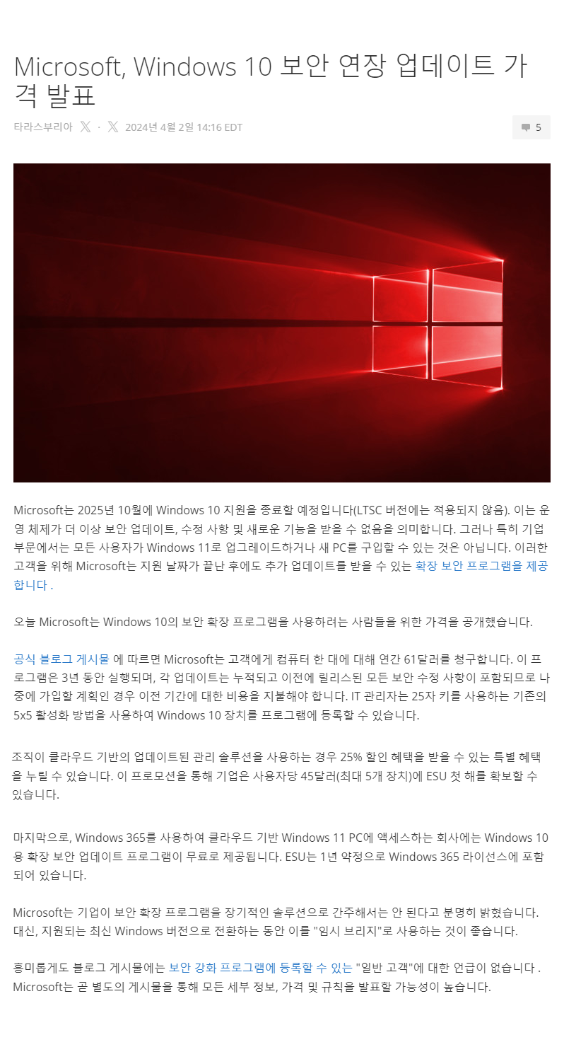 기업용 윈도우는 보안상 업데이트를 계속할 수 밖에 없을 것입니다..