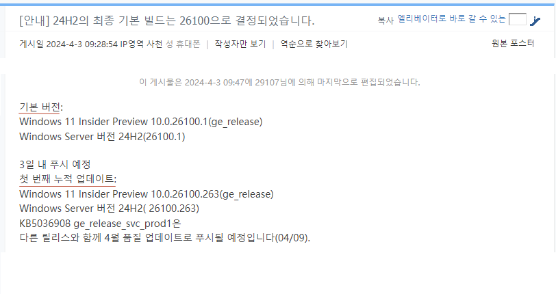 첫번째 누적 업데이트(KB5036908) 가 정기업데이트인 다음주 4월 9일에 배포될 거라고 하네요.. (빌드 26100.263)