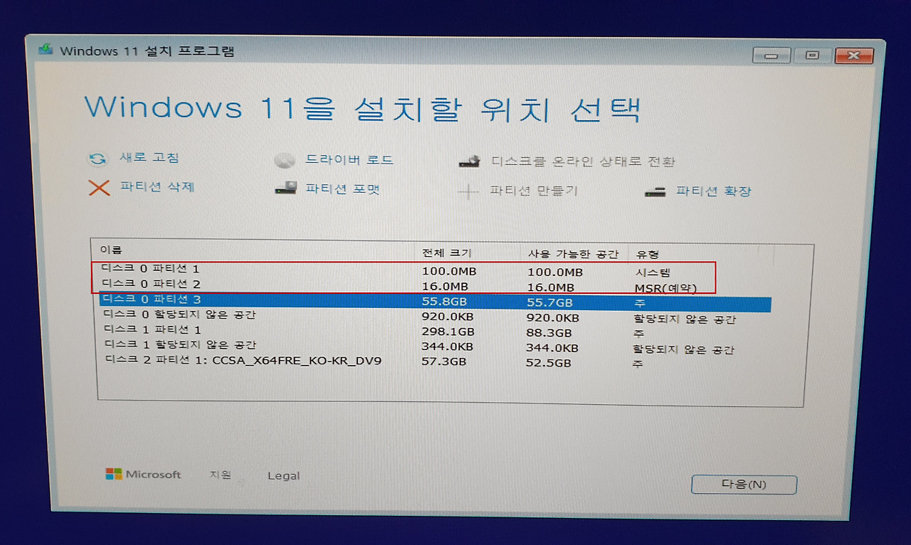 [경우 1] --- MSR (예약) 파티션이 존재하는 경우 (MS 표준 정상적인 파티션이 만들어져 있는 경우)