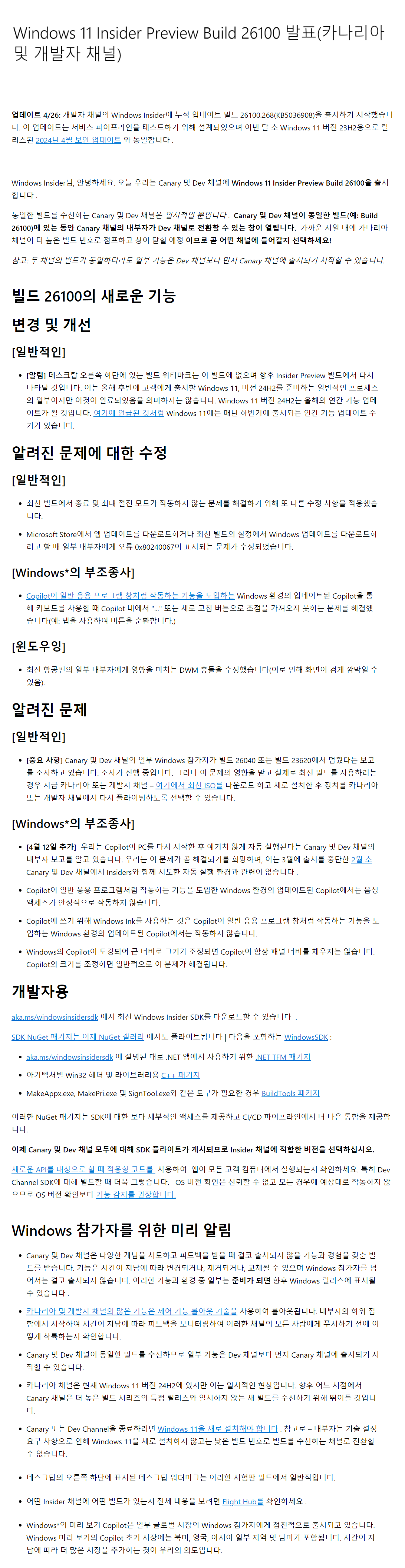○ 개발자 채널 [Canary] = Windows 11 : 빌드 26200.5001 (= 참가자 빌드)