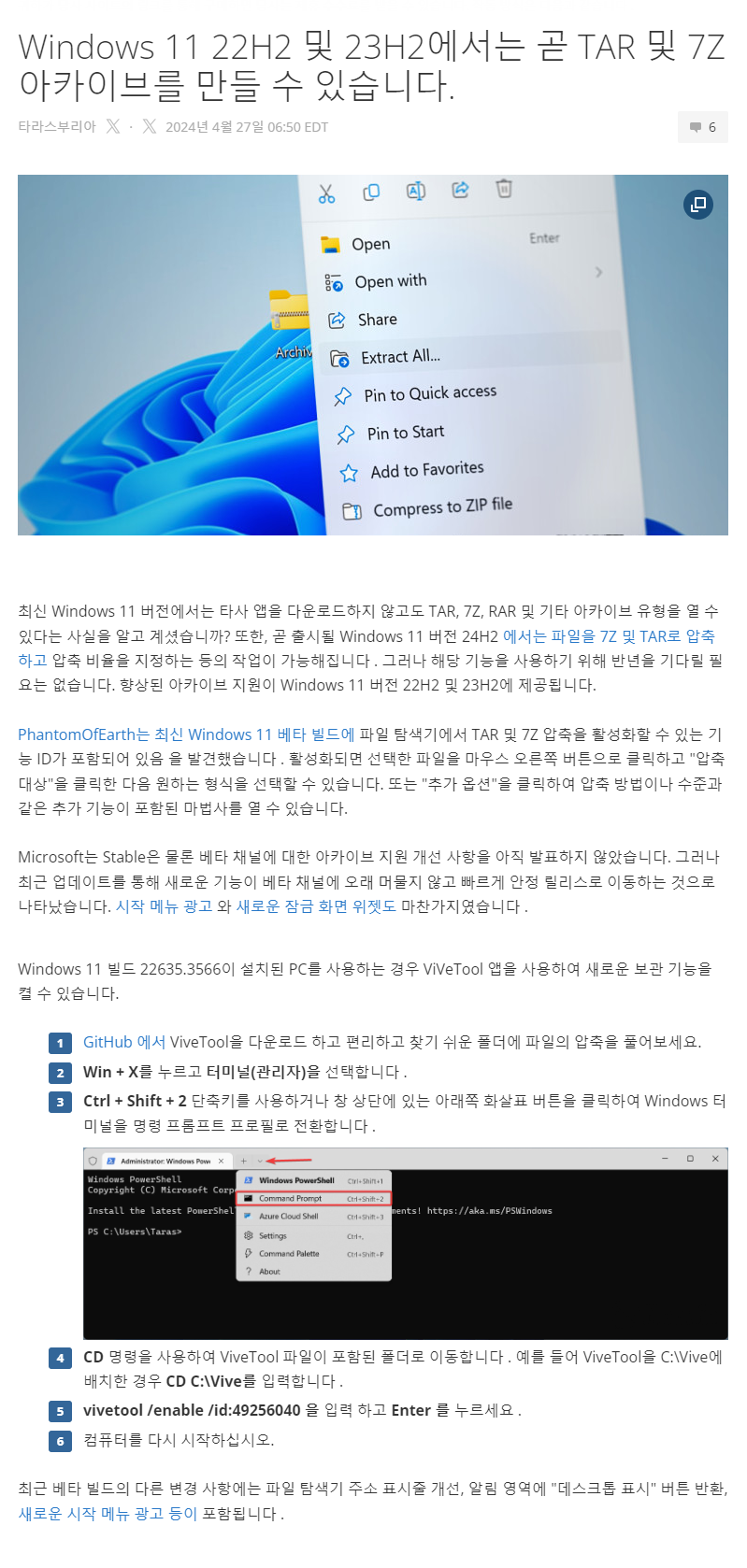 Windows 11, Beta 채널 빌드 22635.3566에서 7zip, TAR 압축이 지원을 활성화는 방법