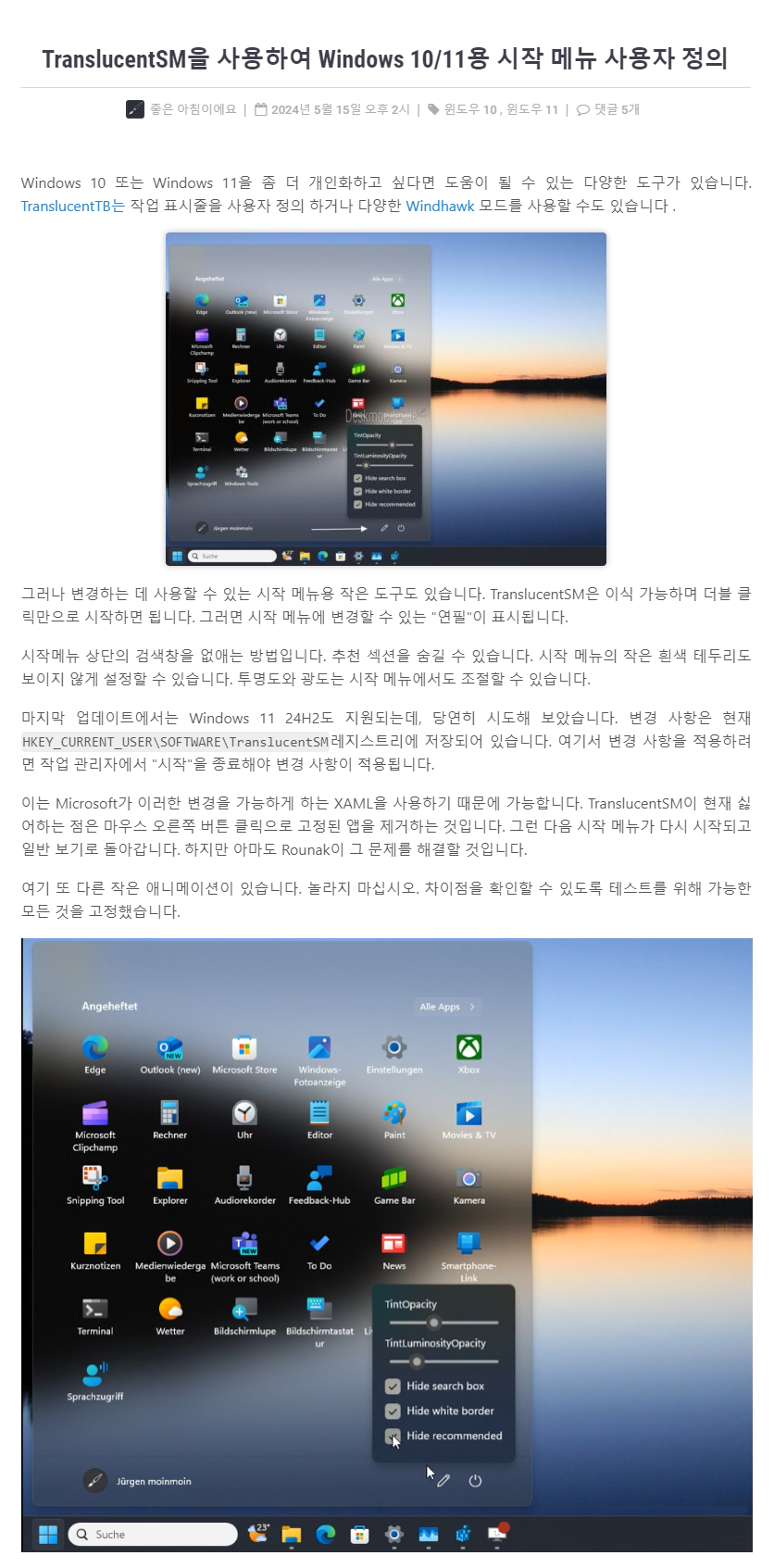 시작 메뉴의 검색 창 제거, 권장섹션 제거, 반투명을 해주는 프로그램입니다.