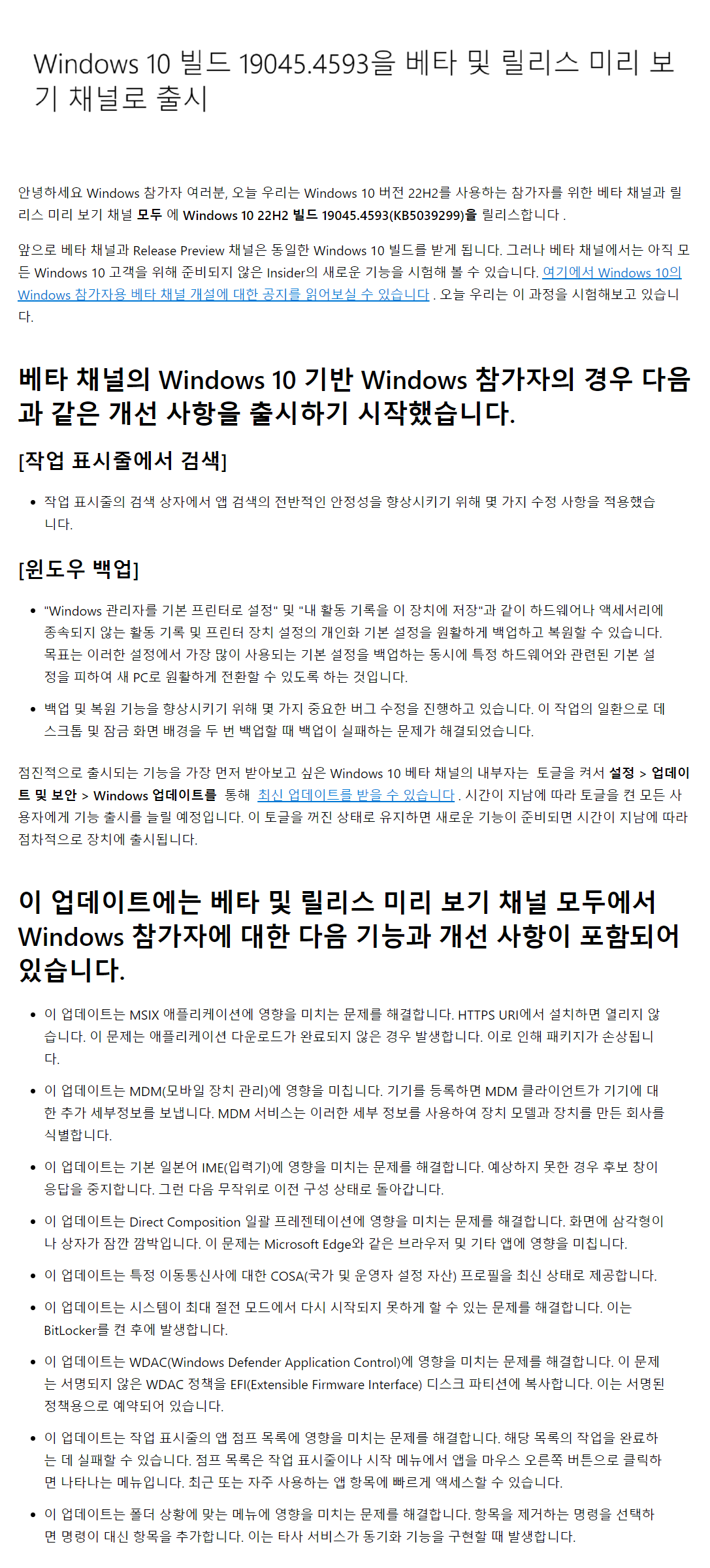 ○ 베타 채널 [Beta] / 미리보기 채널 [Release Preview] = Windows 10 : 빌드 19045.4593 (= 참가자 빌드)