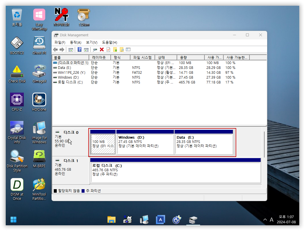 PE로 부팅해서 C 드라이브를 2개의 파티션으로 나눠봤습니다...