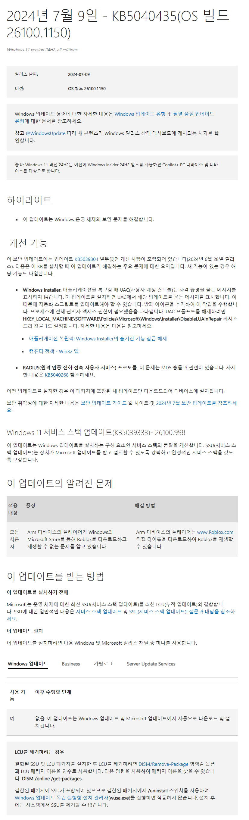 KB5040435 = 누적 업데이트(26100.1150) (Cumulative update : CCU) (2024-07-09)
