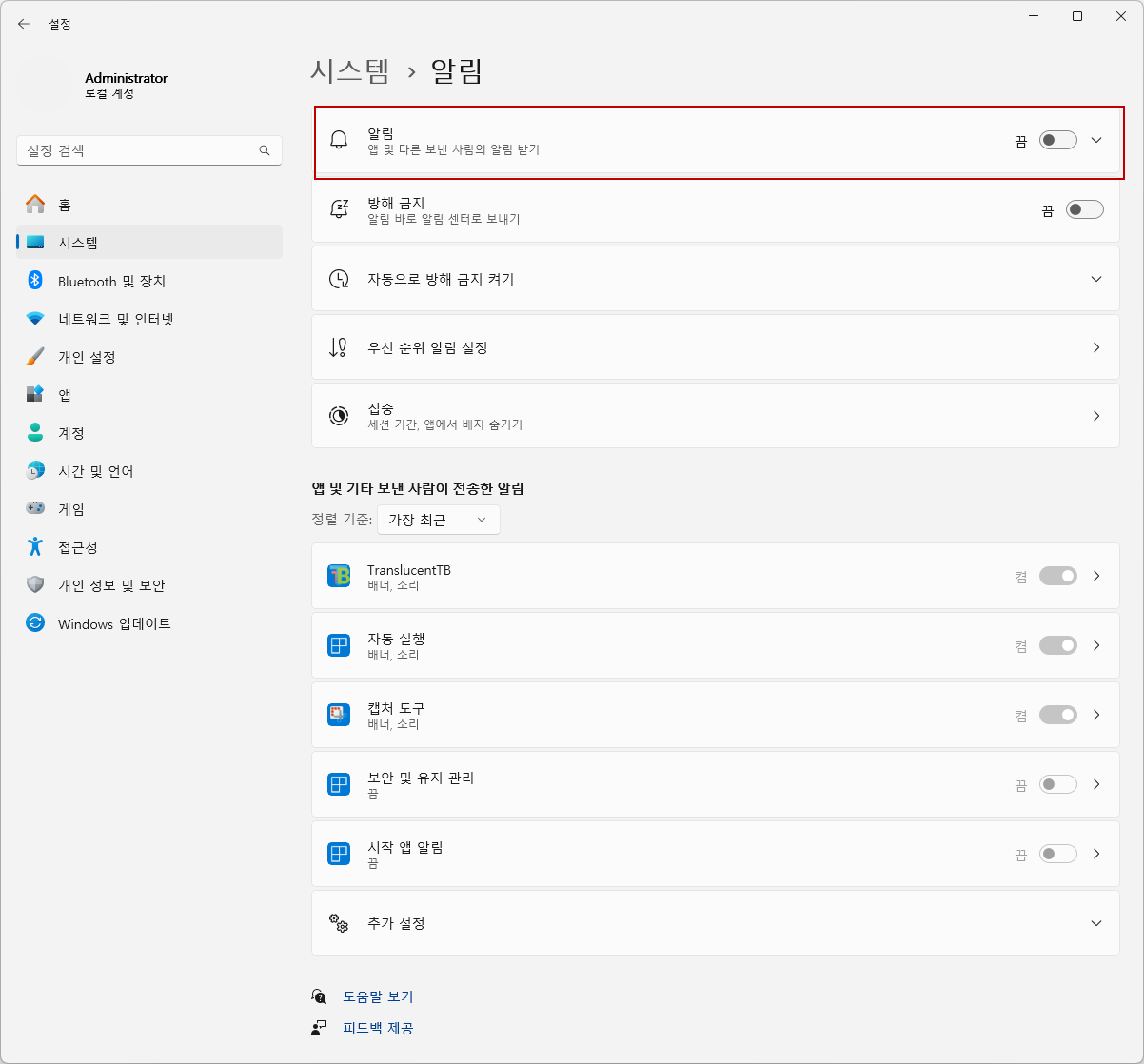 아래 처럼 시스템 트레이에서 [알림벨]을 숨기는 방법입니다.