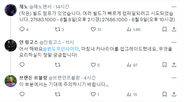 | Windows, 다시 버전 번호 점프 시작 27683.1000 - 8월 8일(~오후 2시) 27686.1000 - 8월 9일(~10PM) |