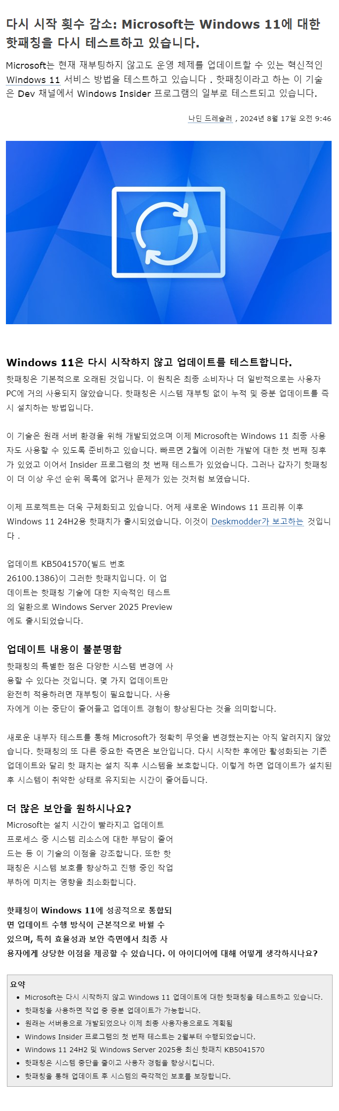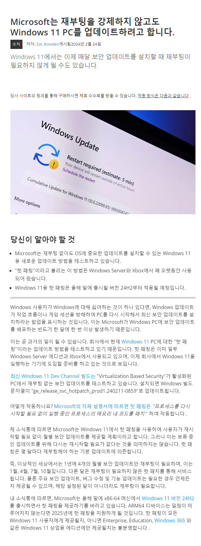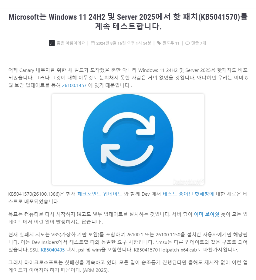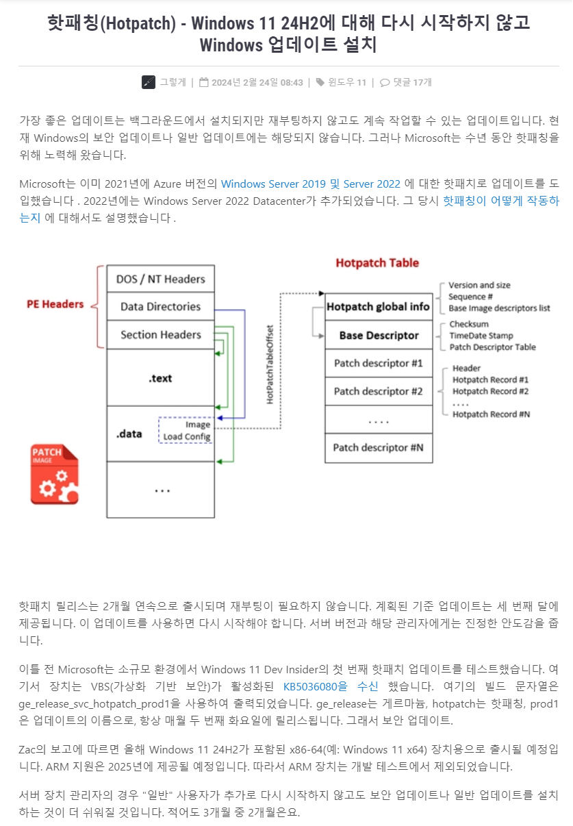 핫패칭(Hotpatch) - Windows 11 24H2에 대해 다시 시작하지 않고 Windows 업데이트 설치