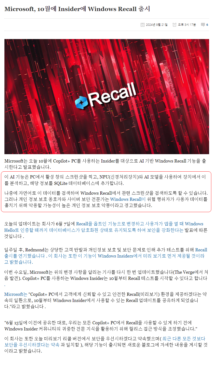 보안 문제 때문에, 개발이 보류되었던 Recall이 10월에 출시한다고 하네요...