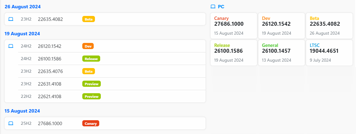 ○ 미리보기 채널 [Release Preview] = Windows 11 : 빌드 26100.1586 (= 참가자 빌드)