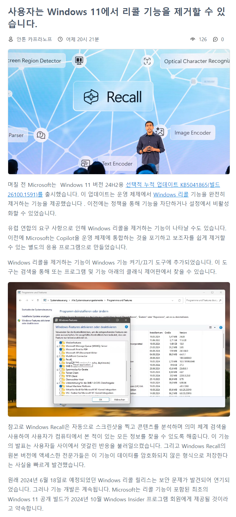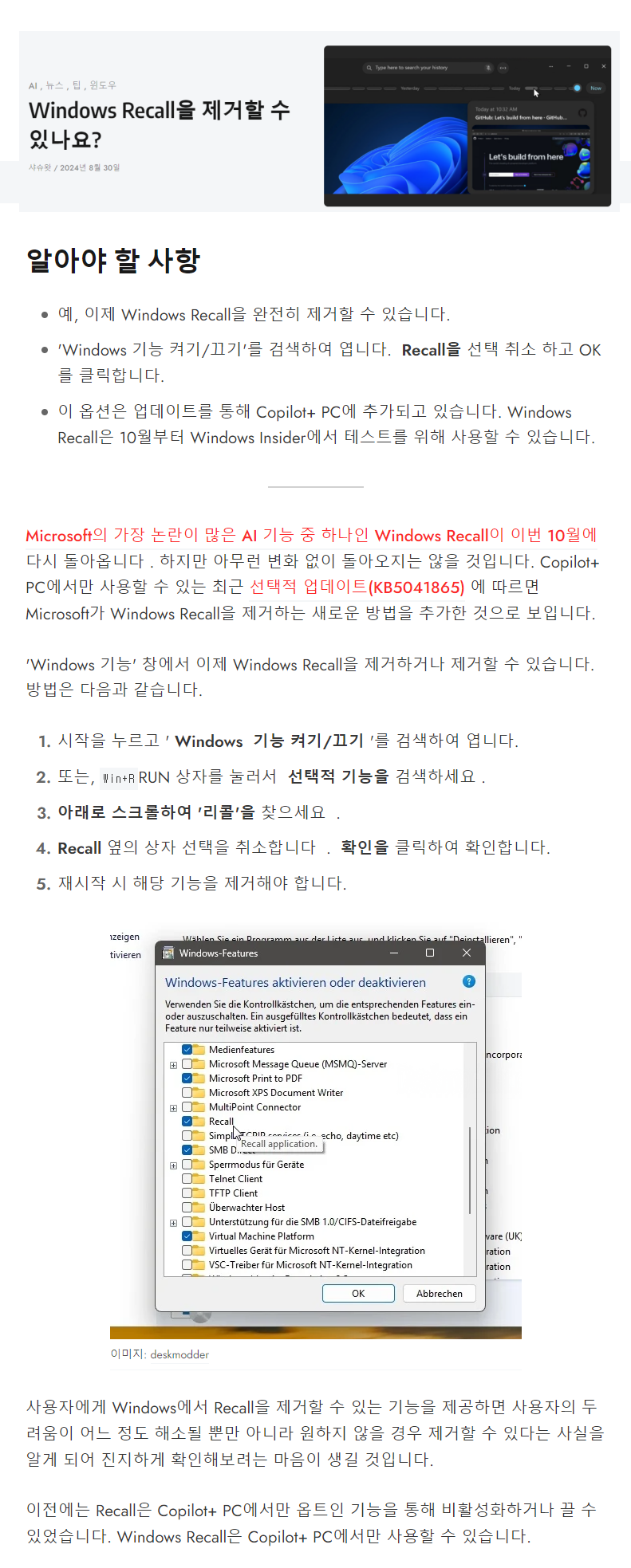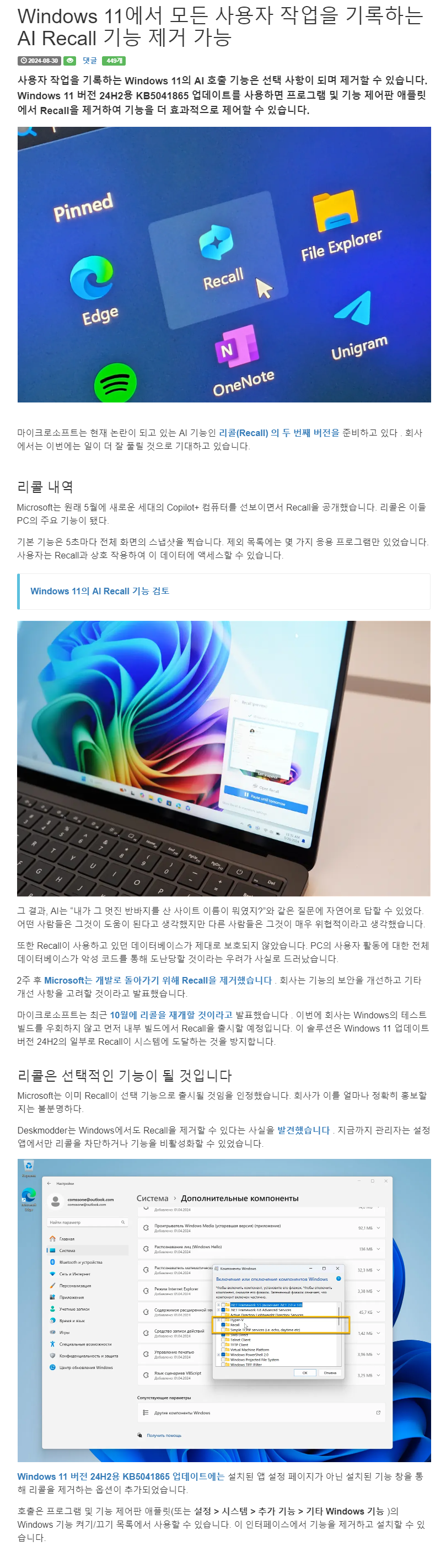 다음달말 또는 10월 초쯤에 24H2가 정식 출시되면 Recall 기능이 탑재될 모양입니다....