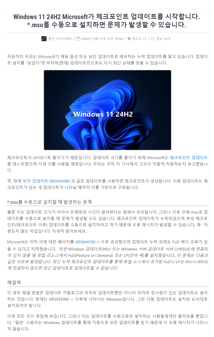 Windows 11, 24H2 RTM의 누적 업데이트 파일(KB5043080) : 26100.x → 26100.1742 (= 일반 사용자용 월간 보안 업데이트)